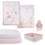INCLUDED: This versatile nursery bundle includes: 1 reversible comforter/milestone blanket (34”x43″) with 2 felt frames to indicate weeks & months, 2 different all-over print fitted sheets (standard crib mattress size), 1 character buddy blankie (12”x12″) and 1 printed storage tote with rope handles (15”x11”x4″).