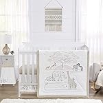 This set boasts white and beige 100% cotton fabrics paired with embroidered earth tone stitching to bring together this safari theme for your little adventurer