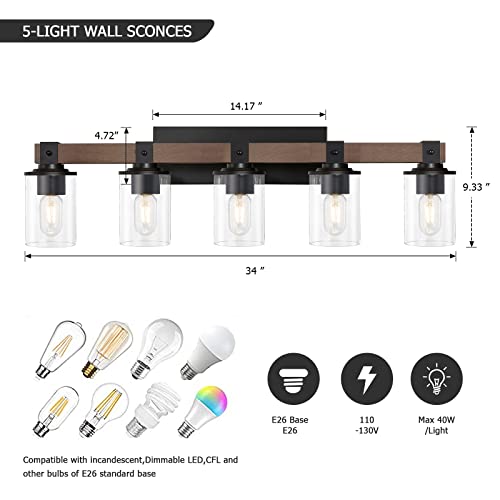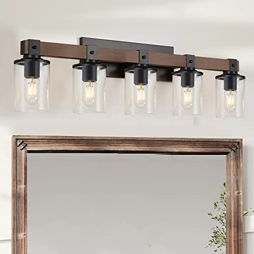 This handcrafted vanity light features a faux-wood back plate, classic black finish and 5 clear Cylinder Glass Shade with a modern accent for enough illumination of your space, making a little extra interest to your bathroom, kitchen, dressing room, vanity table, powder room, etc