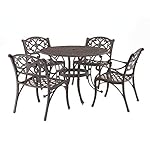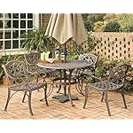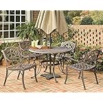 The difference between an average backyard and an open air sanctuary is found the classic comfort and traditional style that Sanibel delivers. This 5-piece dining set includes a round table and four arm chairs, all made of cast aluminum with a powder-coated finish and a clear coat that offers total protection from the elements. The tabletop and seat design allows water to quickly drain through to prevent pooling or staining. The center umbrella hole includes a cap to cover it when not in use.
