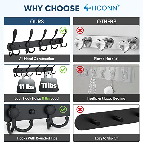 [PREMIUM QUALITY] TICONN wall-mounted coat hanger built with premium material. With the combination of stainless steel backing plate and aluminum alloy hooks, each tri-hook can hold up to 11lbs.