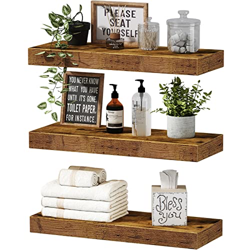 QEEIG Floating Shelves for Wall Bathroom Shelf Bedroom Kitchen Farmhouse Small Book Shelf 16 inch Set of 3, Rustic Brown (015-BN3)