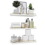 Home Shop Farmhouse Shelves Farmhouse Floating Shelves WOPITUES Floating Shelves with Gold Metal Guardrail, Shelves for Wall Decor Set of 3, Wall Shelves for Bedroom, Bathroom, Kitchen, Living Room, Plants, Picture Frames, Art- White and Gold