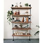Anynice 5 Tier Industrial Ladder Shelf Bookcase, Wall Mounted Wood Metal Pipe Rustic Bookshelf for Living Room (Weathered Brown, 10″ D x 36″ W x 70″ H)