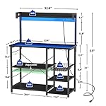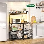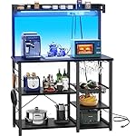 Topfurny Bakers Rack with Power Outlet, Microwave Stand, Kitchen Storage Shelf with Led Lights, Coffee Bar Station with Wine Glass Holder, Kitchen Rack for Spices, Pots, and Pans, Black