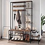[Ample Storage Space]: HxLxW-70.86″x48.8″x11.8″. Hang coats, scarves on the movable metal hooks and keep books and bags organized on the side shelves. The upper shelf of the coat stand adds extra storage space for decor display. Different heights of shoe bench is designed for storing your high heels, boots, sports shoes. The side shelves and small bench can be interchanged.