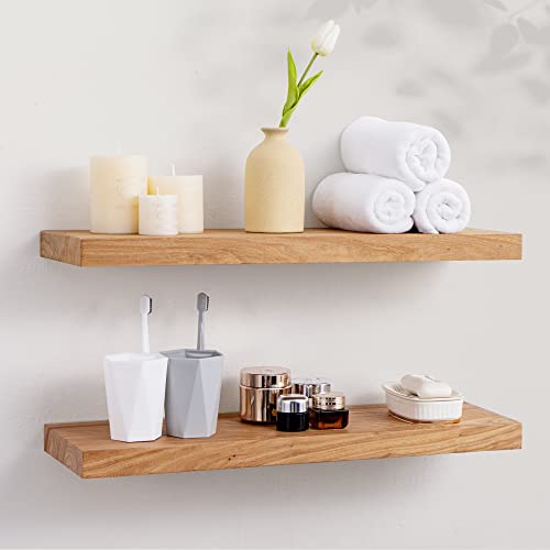 Axeman Floating Shelves for Wall, 24”W x 8” D Rustic Solid Elm Wood Wall Shelves for Storage, Wall Mounted Display Shelving with Invisible Heavy-Duty Metal Bracket (Natural, 2PCs)