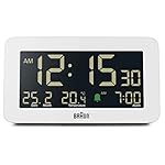 Braun Digital Alarm Clock with Date, Month and Temperature Displayed, Negative LCD Display, Quick Set, Crescendo Beep Alarm in White, Model BC10W.