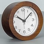 AROMUSTIME 3-Inches Round Wooden Alarm Clock with Arabic Numerals, Non-Ticking Silent, Backlight, Battery Operated, Brown