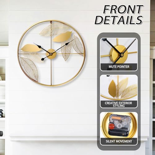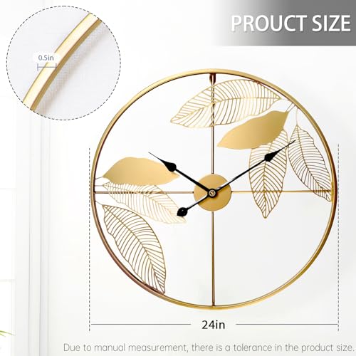 KEQAM Large Wall Clock for Living Room,Gold Decorative Leaf Wall Clock,Big Modern Round Silent Non-Ticking Battery Operated Metal Wall Clocks,Kitchen Clock Home Decor (24 Inch)