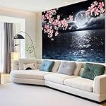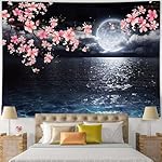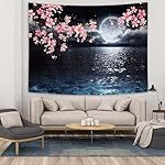 Ocean Tapestry Moon Tapestry Wall Hanging Pink Cherry Blossom Japanese Anime Scenery Tapestry for Bedroom Living Room Decor Artistic 60 x 40 Inches