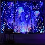 Racunbula Blacklight Forest Jellyfish Tapestry UV Reactive Nature Tree Tapestry Trippy Fantasy Starry Sky Tapestry Aesthetic Wall Tapestry Hippie Jungle Plants Tapestry Wall Hanging for Bedroom