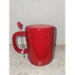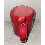 This mug is red on the outside with a pink interior and the words Happy Valentine’s Day embroidered on the outside in white. The handle has a red heart with a stem drilled through it.